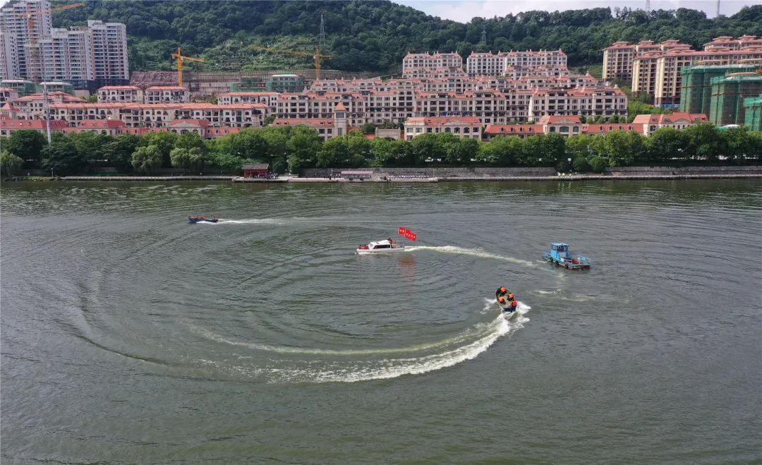 小组驾驶冲锋舟至群众落水处,对落水者进行救援,救援快艇对故障船只上被困的群众进行转移。