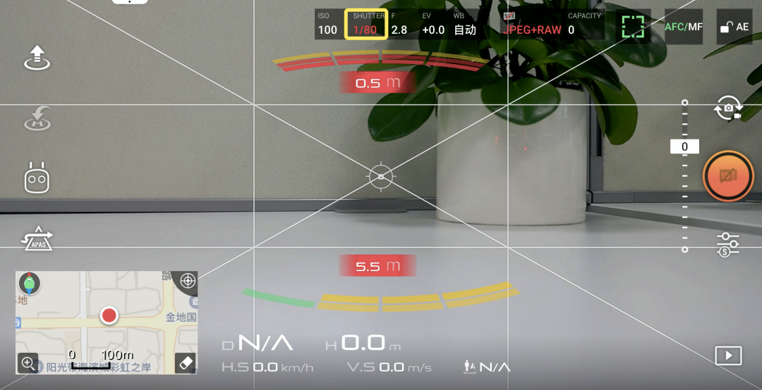 这里需要强调一点的是,当 ISO 为手动设置状态,使用 S 档速度优先模式拍摄,调节右拨轮时,可能会发现 DJI GO 4 界面速度值变成红色。此时是提示飞手:在该速度下拍摄的画面可能会曝光不足,需要调整速度值至白色。