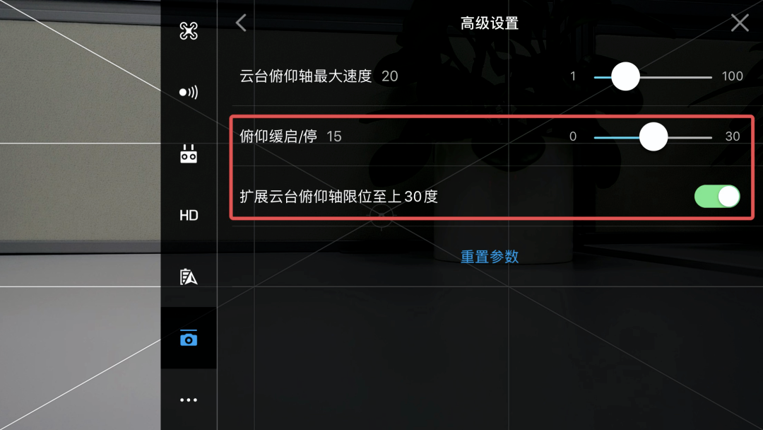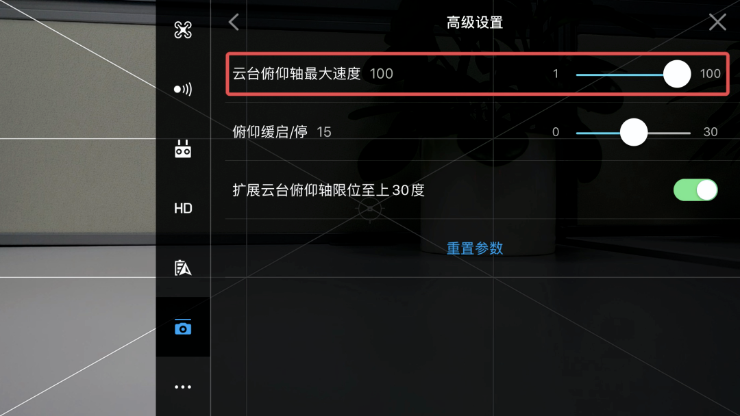 云台俯仰限位是通过开关“扩展云台俯仰轴限位至上 30 度”调节。云台过于向上有可能镜头会拍到桨叶。在急速飞行时,飞机为了保护镜头不与机身顶部碰撞,也会主动关闭这一项。所以这项功能,是在平稳飞行时以获得更多的天空视角而设计。