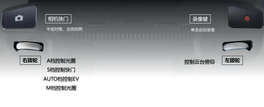 我们先说右拨轮,在不同的拍摄模式下,无人机遥控器右拨轮的作用完全不同。在 A 档光圈优先模式下,右拨轮可调整光圈大小,往左光圈数值变小,光圈变大,往右光圈数值变大,光圈变小;S 档速度优先模式下,右拨轮调整快门速度,往左数值变小(注意有倒数),快门速度变快,往右数值变大,快门速度变慢;M 档手动模式下,右拨轮调整光圈大小,往左光圈数值变小,光圈变大,往右光圈数值变大,光圈变小;AUTO 档自动模式下,右拨轮则控制的是EV 曝光补偿,往左曝光负补偿,画面变暗,往右曝光正补偿,画面变亮。