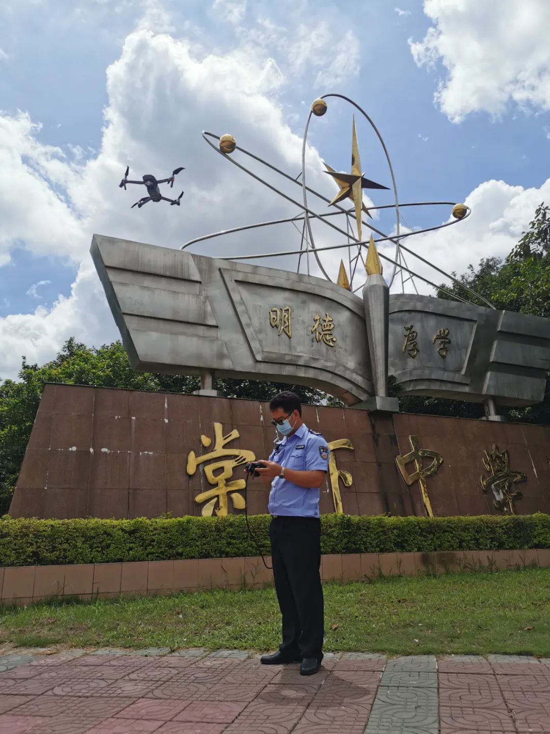 充分发挥智慧护“考”,蓬江公安在各考点开考前、考试后指派无人机开展巡航飞行,对考点周边治安环境、交通秩序进行空中巡逻,排查安全隐患,确保高考安全有序进行。