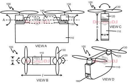 双旋翼这项专利展示了一个小矩形的圆形边缘,顶部装有两个马达,看起来可以安装在旋转的盘子上。这些板通过旋转来调整无人机产生的推力角度,从而弥补了四个马达的不足。图纸中我们还能看到什么看起来像一个摄像头孔在无人机的前面,从它的大小,我认为无人机,如果释放,会更有问题的无人驾驶飞机在空中飞行你可以迅速把酷角。