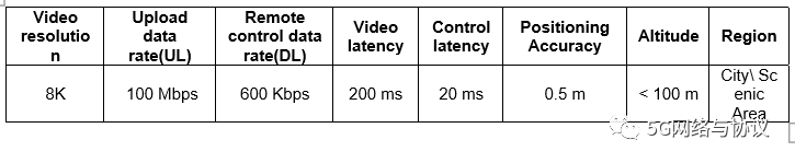 无人机与全景虚拟现实VR直播相结合,将使现场视频体验像观众在现场一样。该系统基于无人机上搭载的360度球面摄像机系统。可以捕捉和编码4K视频,然后通过3GPP系统实时上传到云端。随着8K等高分辨率视频的发展,5G系统的相关性能指标也需要更新。根据中国IMT2020(5G)推广小组发布的无人机支持VR直播应用的性能要求如下表所示: