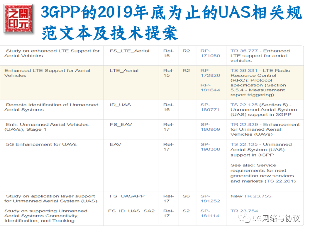 到2019年底为止的3GPP有关UAS的技术文档如下: