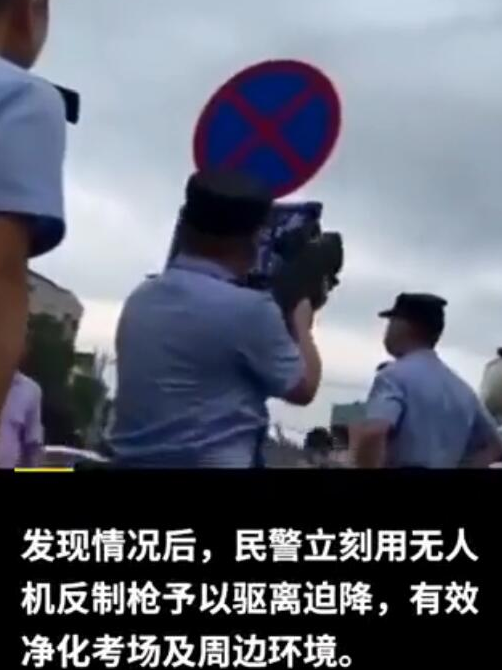 据湖北咸宁公安消息,7月7日8时许,赤壁市第一级高级中学考点外,考生正在进入考场时,一市民利用无人机拍摄考点外送考场景,被该考点反高科技舞弊组巡防民警发现后,使用无人机反制枪予以驱离迫降。