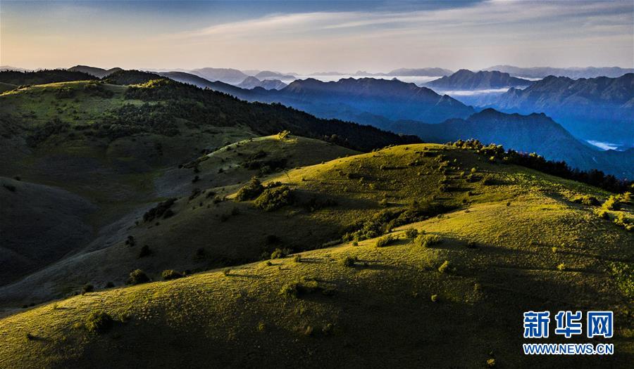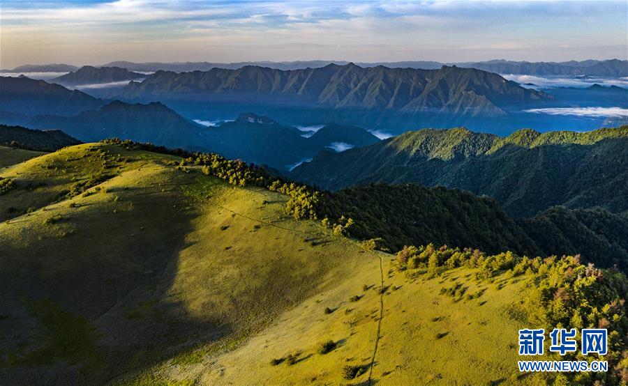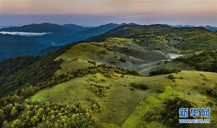 位于陕西省安康市岚皋县与重庆市城口县交界处大巴山神田主脊北坡的神田草甸,面积超过1.1万亩。夏日的朝霞中,起伏的草甸仿佛一块宽大无边的绿色地毯,镶嵌在大巴山上,如诗如画。 新华社记者 陶明 摄