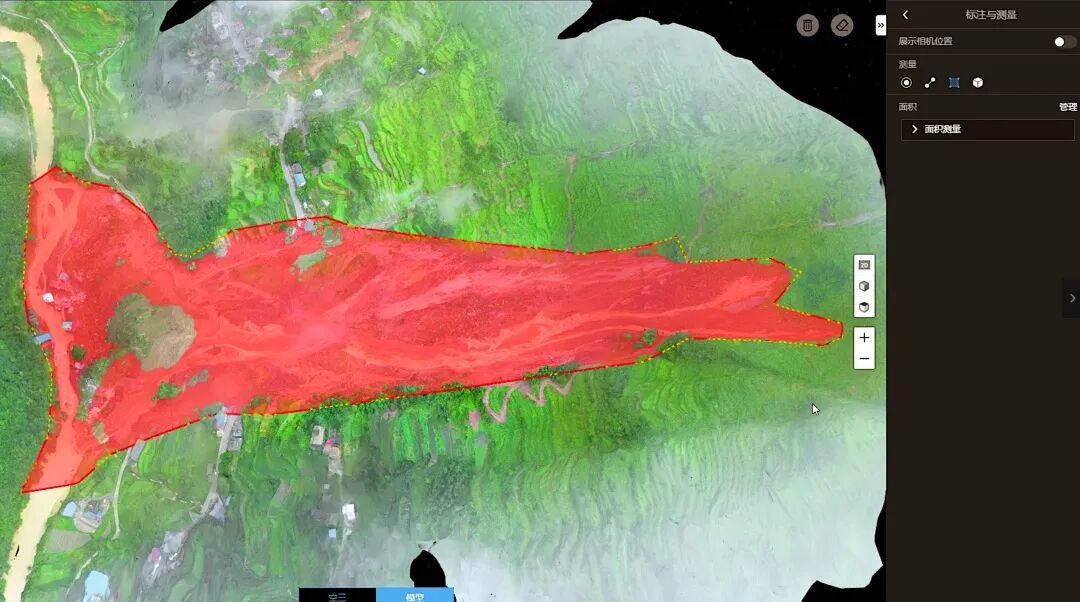 根据模型,指挥中心分析出了 4 个重点救援区域,并计算出当地滑坡面积与滑坡土方量。