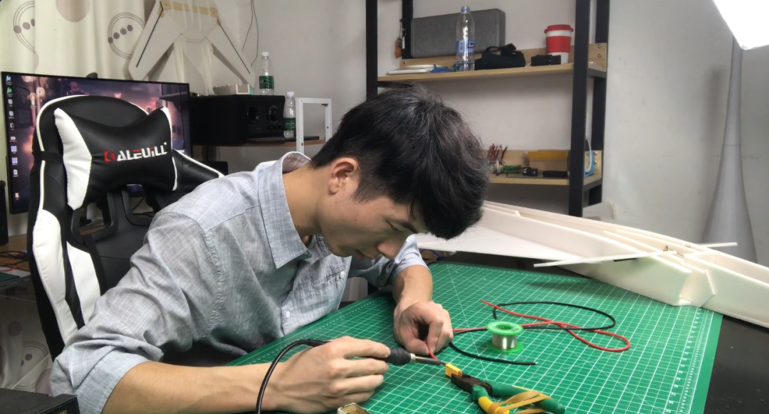 组装飞行器时,他使用了最熟悉的热熔枪、泡沫胶等工具,并开始计算、考量飞行器的重心等力学问题。