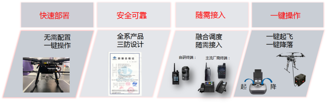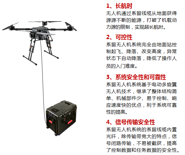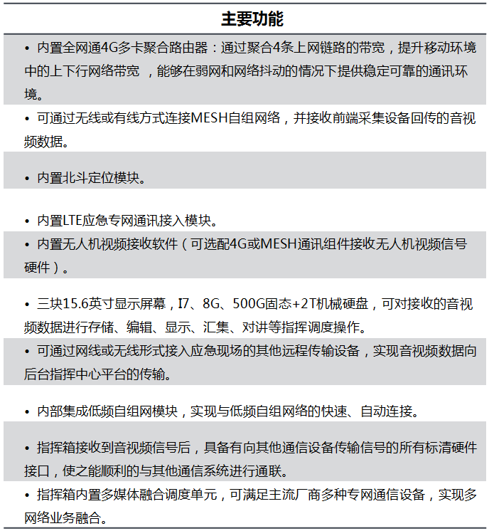 我国是一个灾害频繁、灾害面广、灾害损失严重的国家,所以我国对于突发事件应急处置方面一直非常重视;不断发生的自然灾害和突发事件,对我国应急通信也是一个严峻考验。由于台风、地震、洪水、泥石流、森林火灾、雨雪冰冻等自然灾害导致断电、断路、断网(“三断”)的情况发生,给抢险救灾工作带来了很大的困难。 普天宜通一直致力于应急现场通信解决方案的研究,当下应急现场指挥通信手段繁杂,存在应用难,维护难等问题,现场资源离散,统一指挥,协同作战能力低下,使得救援通信难以得到有效保障。 公司从自身业务优势出发结合无人机技术,通信技术,虚拟融合实景等技术推出应急现场空地通信指挥系统解决方案。该系统同时具备LTE覆盖功能和自组网中继功能以及融合实景功能,在应急现场可以第一时间迅速组建起覆盖数十平方公里面积的专用宽带通信网络。 该方案旨在解决应急现场统一通信,统一指挥的问题,增强救援工作协同作战,资源融合的能力;LTE的覆盖方案规避了现场公网拥塞,救援人员通信,传输不畅等问题;系统搭载云台相机,使得整套方案兼备满足应急现场通信和高空勘察的功能。 指挥系统主要由可折叠四旋翼系留无人机、系留综合控制箱、系留线缆、机载通信基站、现场融合通信指挥箱、视频指挥调度系统、发电机七部分组成。 本文由“壹伴编辑器”提供技术支持 指挥一体化 调度可视化 实景实时指挥化 本文由“壹伴编辑器”提供技术支持 与传统电动多旋翼无人机、油动直升机、系留气球、系留飞艇相 比,系留多旋翼无人机系统在航时、可控性、购置成本和使用成本、安全性等方便具有独特优势。 本文由“壹伴编辑器”提供技术支持 本文由“壹伴编辑器”提供技术支持 本文由“壹伴编辑器”提供技术支持 本文由“壹伴编辑器”提供技术支持 本文由“壹伴编辑器”提供技术支持 本文由“壹伴编辑器”提供技术支持