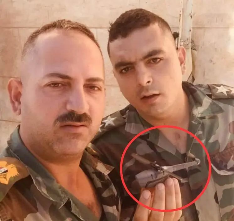 叙利亚政府军士兵展示缴获的“黑黄蜂”微型无人机