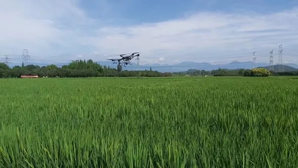 一架无人机在杂交水稻上方约一两米处低飞,螺旋桨卷起的气流在稻田里划出一道道波浪,激扬起每一株雄性父本水稻花粉,使花粉均匀地飘向雌性母本水稻。