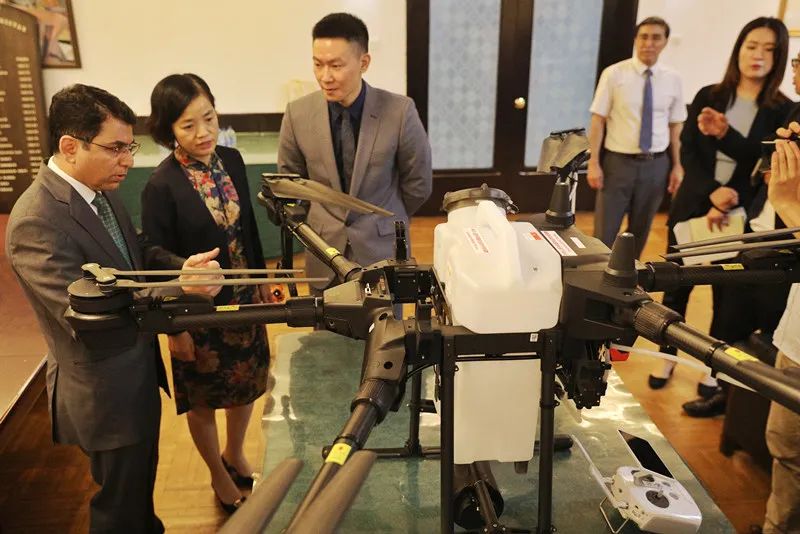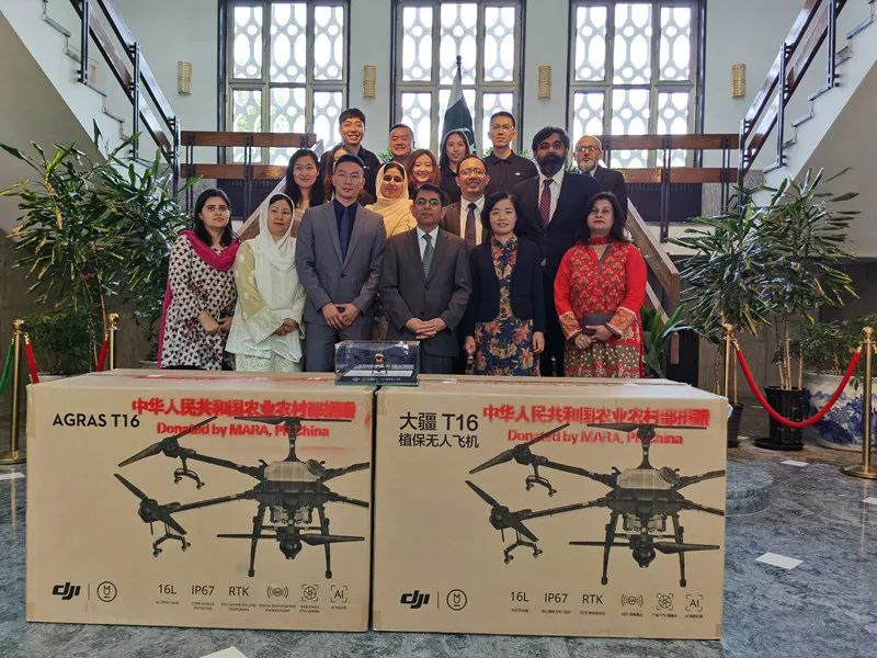 2020年7月23日,在北京巴基斯坦大使馆内,中国农业农村部正式向巴基斯坦国家粮食安全和研究部捐赠12台大疆T16植保无人机。这批植保无人机将作为援巴物资,帮助当地抗击蝗灾,保护粮食安全。
