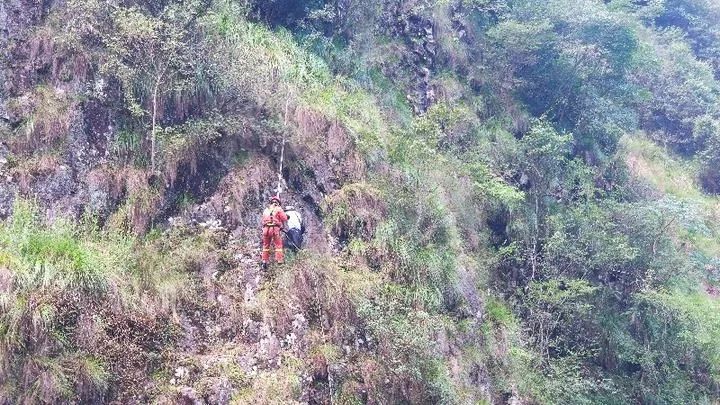 经现场勘察发现,该男子被困在距离山涧水面近20米的崖垛处,水流深不见底,且山崖的土质松软,施救支点难以固定,加上山势陡峭,通讯信号弱,使得救援工作难度加大。