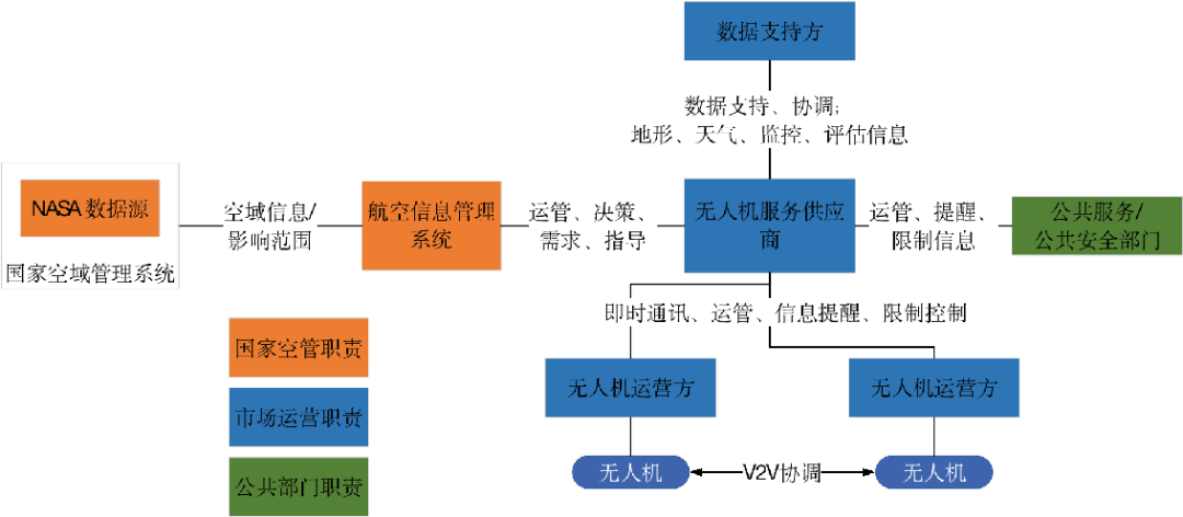 现阶段无论是NASA UTM还是欧洲 U-space的基本架构均有两个部分:云端管理端和地面服务端。具体细分包含:国家空管数据管理、国家空管系统、飞行情报管理系统、支持数据服务商、无人机服务商、无人机实际运营方。