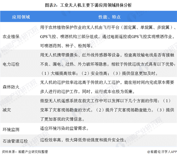 目前,工业无人机的主要应用领域包括:电力巡检、应急救援、航空摄影、水利应用、农药喷洒、航空测绘、国土资源、旅游业、管线巡查、医疗业、海事监察、农业林业、物流运输、交通管制、气象监测、反恐防暴等。随着工业无人机技术水平的不断提升,各行各业对无人机应用需求的提升,工业无人机应用领域将不断扩大,并朝着更加深化、细化的方向发展。