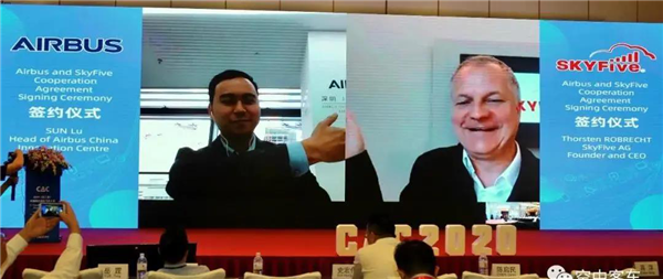 机上互联网行业健康的发展,离不开产业链上下游所有同仁的共同努力,离不开相关企业的紧密合作。空中客车中国创新中心负责人孙路和SkyFive公司创始人兼首席执行官Thorsten Robrecht签署合作协议,双方将共同探索开发满足中国市场需求的5G空地互联解决方案。