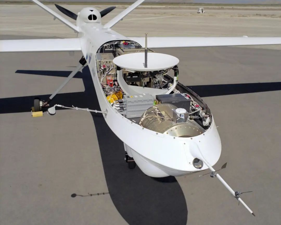 除了卫星天线以外,我们还能在美军死神无人机的机头拆解内构图里,看到位于机头最前端的光学图像捕捉识别模块,后面的那几个褐色大铁皮箱子里,则整合了无人机的机载计算机以及飞控、火控设备。因为是无人驾驶不用考虑人机功效带来的问题,所以机载设备可以见缝插针地把整个机体内部空间塞得满满当当、充分利用。这也是为什么无人机看上去体积那么小,但是却也侦查打击样样精通的原因,现代高科技加持下的技术整合能力在这里体现地非常重要。