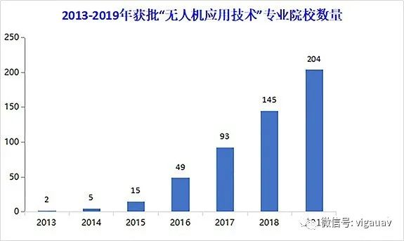 2015年教育部公布新增“无人机应用技术”专业后,不断有院校设立该专业,到2019年设立该专业的院校开始激增,从2016年的49所增长到2019年的204所。到2019年4月,国家人力资源社会保障部,国家市场监管总局、国家统计局联合正式向社会公布无人机驾驶员为新职业,无人机已经成为众多院校竞相追捧的热门专业,同时院校也需要更多的无人机专业师资力量。