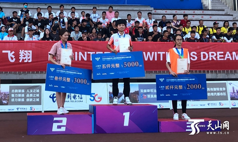 获得穿越机竞速赛女子组个人冠军的新疆选手温丹宁(中)在领奖台上。
