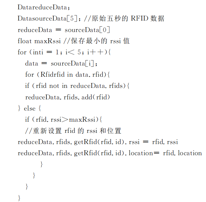 2) 添加其余每秒的数据到初始数据。合并方法是: 遍历新数据中每个 RFID 数据, 若该 RFID 不存在融合数据中, 则把该 RFID 数据增加到 RFID 列表中。若该 RFID 数据已经存在 RFID 列表中,并且把rssi值最大的元数据的当前位置设置为融合数据的位置和rssi值。