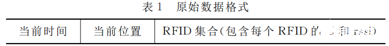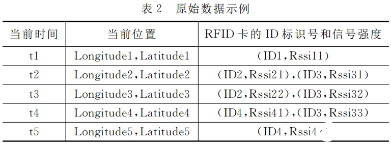 无人机在养殖范围内自动巡航,RFID 读卡器每隔一定时间间隔 T (默认1秒) 扫描区域内的 RFID 标签, 同一时间可能扫描到有多个 RFID 标签和多个信号强度, 组成 RFID 标签集合。RFID 标签集合和当前手机通过 GPS定位获取到的经纬度数据,组成原始数据,格式如表1。