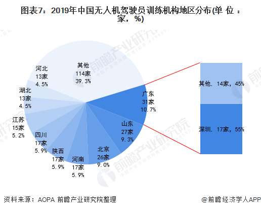 无人机产业链下游主要是运维服务,包括租赁业务、售后服务、培训业务等。目前,在无人机下游衍生产业中,深圳布局也较为完善。截至2019年底,全国经中国AOPA审定合格取得过培训资质的在营无人机驾驶员训练机构共290家。从地区分布来看,广东省以31家排名第一。而在广东省中,深圳又以17家,55%的占比排名全省第一。