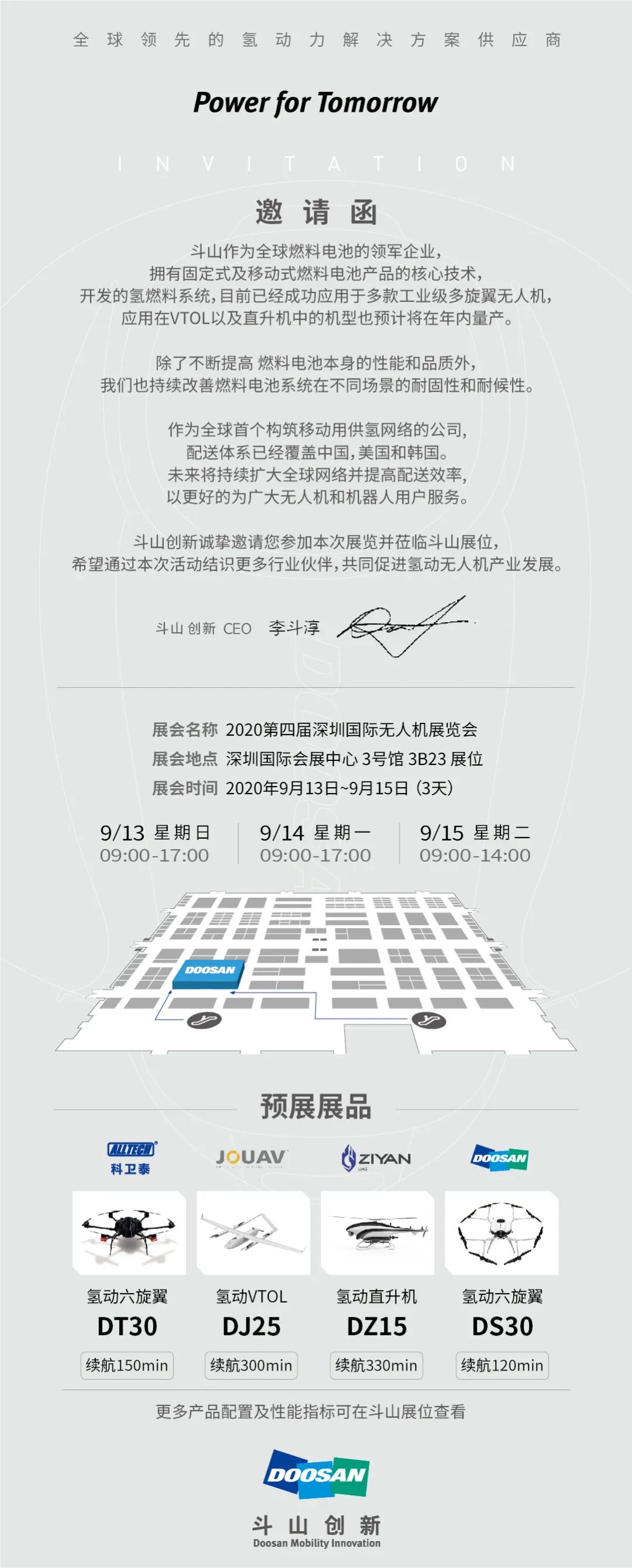 斗山创新(深圳)有限公司(简称:斗山创新)是斗山集团在中国的全资子公司,依靠自有核心技术,致力于开发高性能移动式轻量化燃料电池系统。产品线主要包含1-5kW空冷系统以及5-30KW轻量化水冷系统,目前产品主要应用在工业级无人机,无人船以及机器人领域,后续将用于大载重货运Cargo无人机,UAM及eVTOL等载人飞行器等领域。产品立足国际市场,先后通过了多项国际认证标准,目前多款燃料电池系统已经完成FCC、CE认证,储氢系统完成美国DOT认证、加拿大TC、欧洲TPED、韩国KGS等国际认证,产品和技术均为全球领先水平。