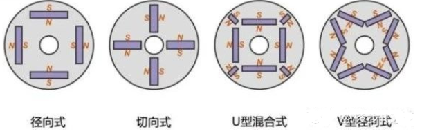 转子上面放有永磁体,根据永磁体的摆放位置不同,分为凸出式永磁转子,内埋式永磁转子。如下图: