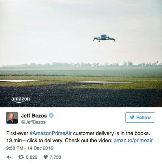 2017年3月,亚马逊在美国本土某地完成了首次无人机包裹快递,具体货物是7罐防晒霜,总计重量约合1.81Kg,这标志着亚马逊在美国的空中快递又向前迈进了一大步。