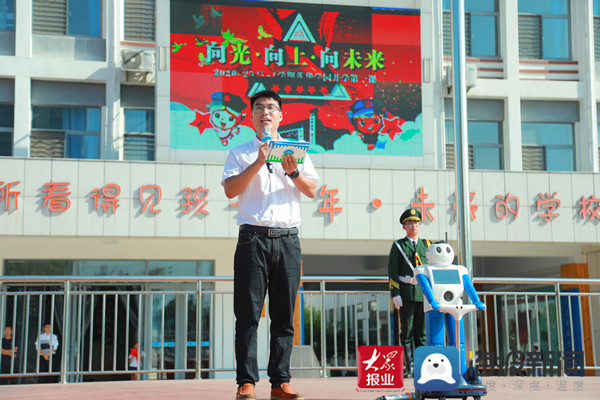 此次开学第一课的主题为“向光·向上·向未来”。与以往不同,在活动现场,机器人“旺仔”的主持亮相瞬间吸引了所有人的目光,可爱的机器人与充满机械感的主持方式,令学生们耳目一新。
