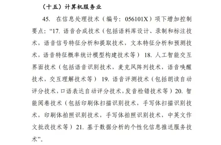 作为对TikTok出售美国业务波澜的回应,8月25日,商务部会同科技部调整发布了《中国禁止出口限制出口技术目录》(商务部科技部公告 2020 年第 38 号),将无人机、AI等敏感技术列为限制出口对象。
