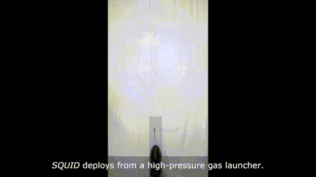 为了改善这种麻烦的无人机起飞方式,加州理工学院和NASA(美国国家航空航天局)的喷气推进实验室开发了一种炮弹发射式的可折叠自主六旋翼无人机,它的名字叫做SQUID,可译为鱿鱼或乌贼,但其实它的全称是:Streamlined QuickUnfolding Investigation Drone——流线型快速展开探测无人机。