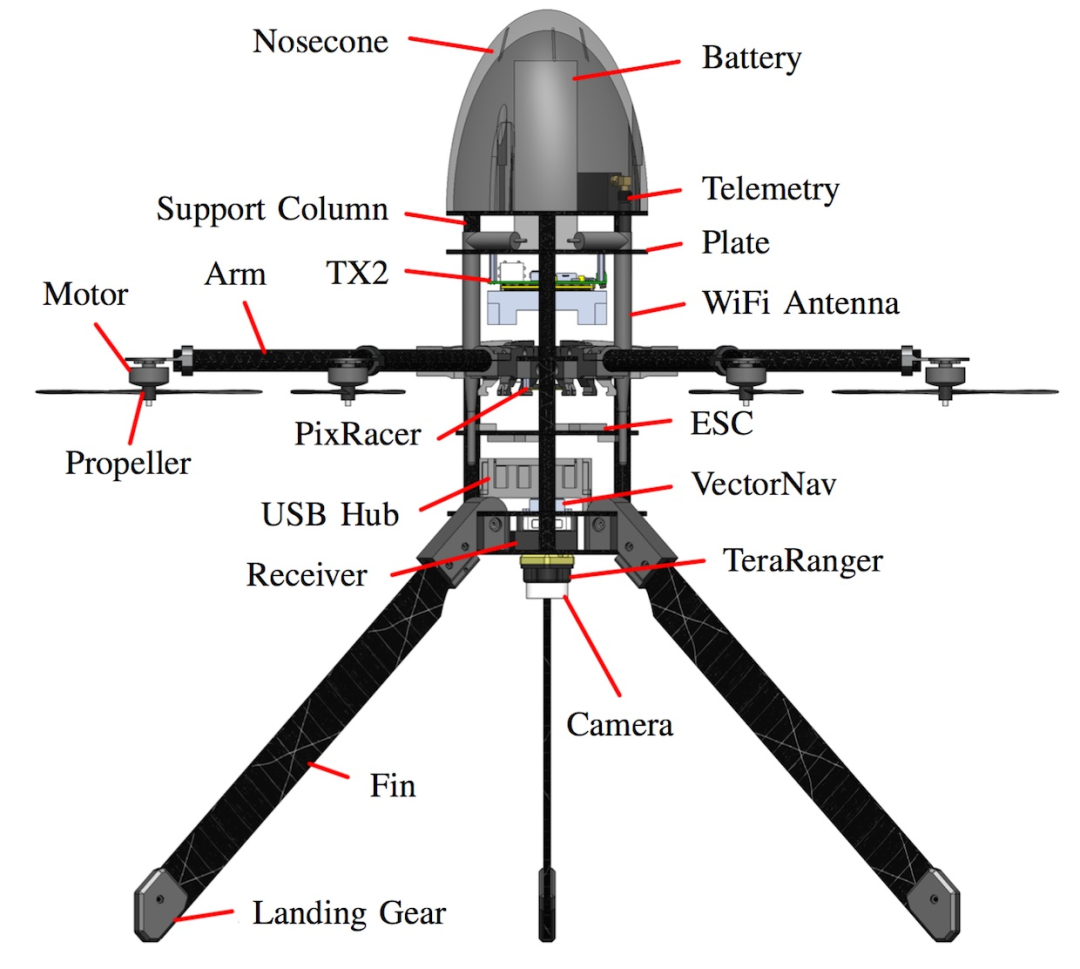 直径 6 英寸对于 SQUID 是一个更大的挑战。大多数无人机受功率或质量的约束,而 SQUID 受体积的约束。开发者不仅需要将所有电池和计算机塞进相应的空间,还必须保证传感器具有所需的视野,同时还要求折叠状态下的臂部、腿部和其它部件处在同一空间内。