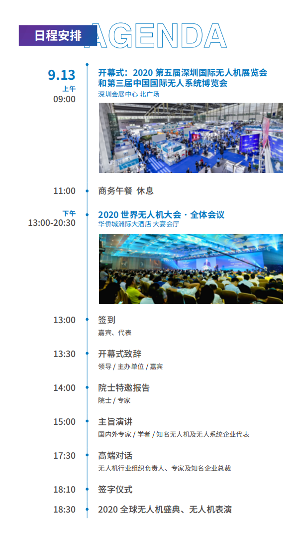 2020年9月13-15日,由中国无人机产业联盟、深圳市无人机行业协会主办,深圳市安博会展有限公司承办的第五届深圳国际无人机展览会将在中国深圳会展中心3、4号馆举办,同期将举行2020第四届世界无人机大会,是目前中国最大的无人机展会,汇聚了来自全球无人机领域的最新技术成果,为中外无人机企业开拓地区市场提供了最佳的平台。