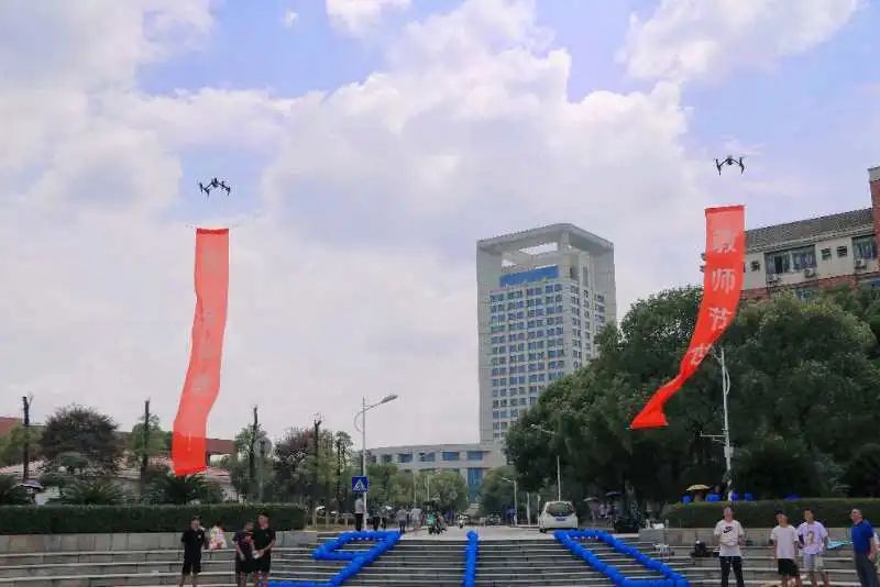 无人机带着两条写有“祝老师教师节快乐”字样的横幅缓缓升起,与地面蓝色气球摆成的“9·10”遥遥呼应着。
