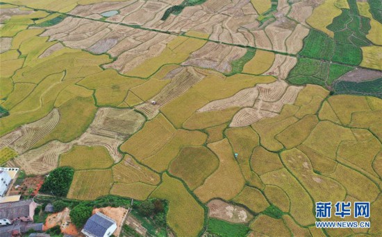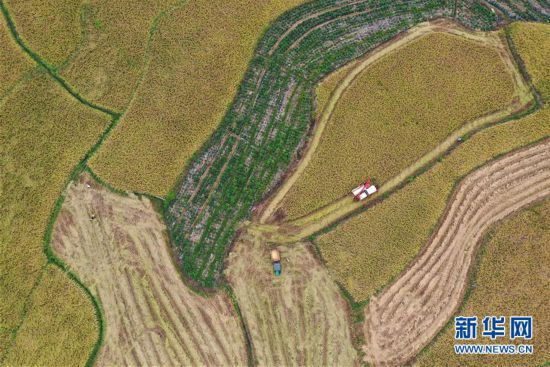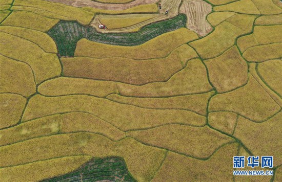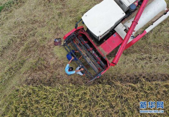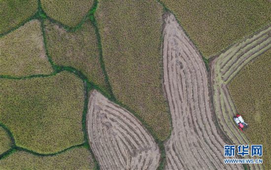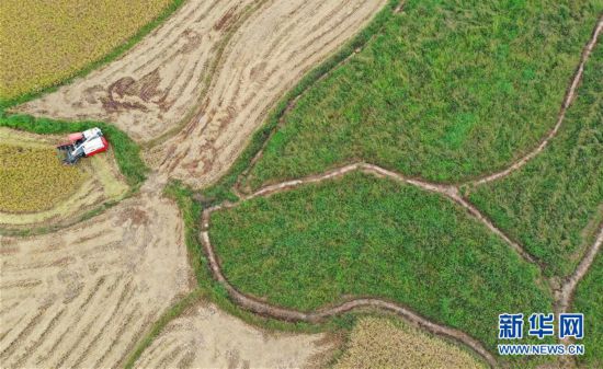 9月10日,村民驾驶收割机在衡东县杨林镇的稻田里收割稻谷(无人机照片)。 时值初秋,农业大省湖南各地的中稻陆续成熟,人们抓住晴好天气,抢收抢晒,田野稻浪翻金、机声隆隆。 新华社记者 赵众志 摄