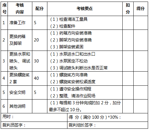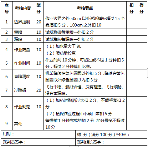 本项考核技术要求:飞手在操作区内操纵植保飞机完成指定地块的植保作业,飞行中不碰撞障碍物,完成作业地块后将植保飞机定点降落在“盲降区”。飞行中飞手感觉不安全时允许就地降落,若因碰撞障碍物或其他原因飞机迫降的、坠机的,均可以进行现场维修或换用备机继续飞行,所有时间均算在内,如不能继续飞行的已完成部分成绩有效。