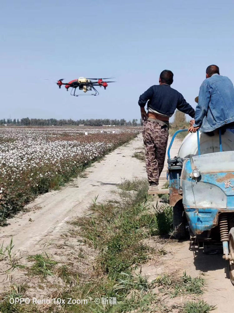 如今,一改以往传统拖拉机打药,无人机喷洒脱叶剂服务在新疆已经非常普遍。