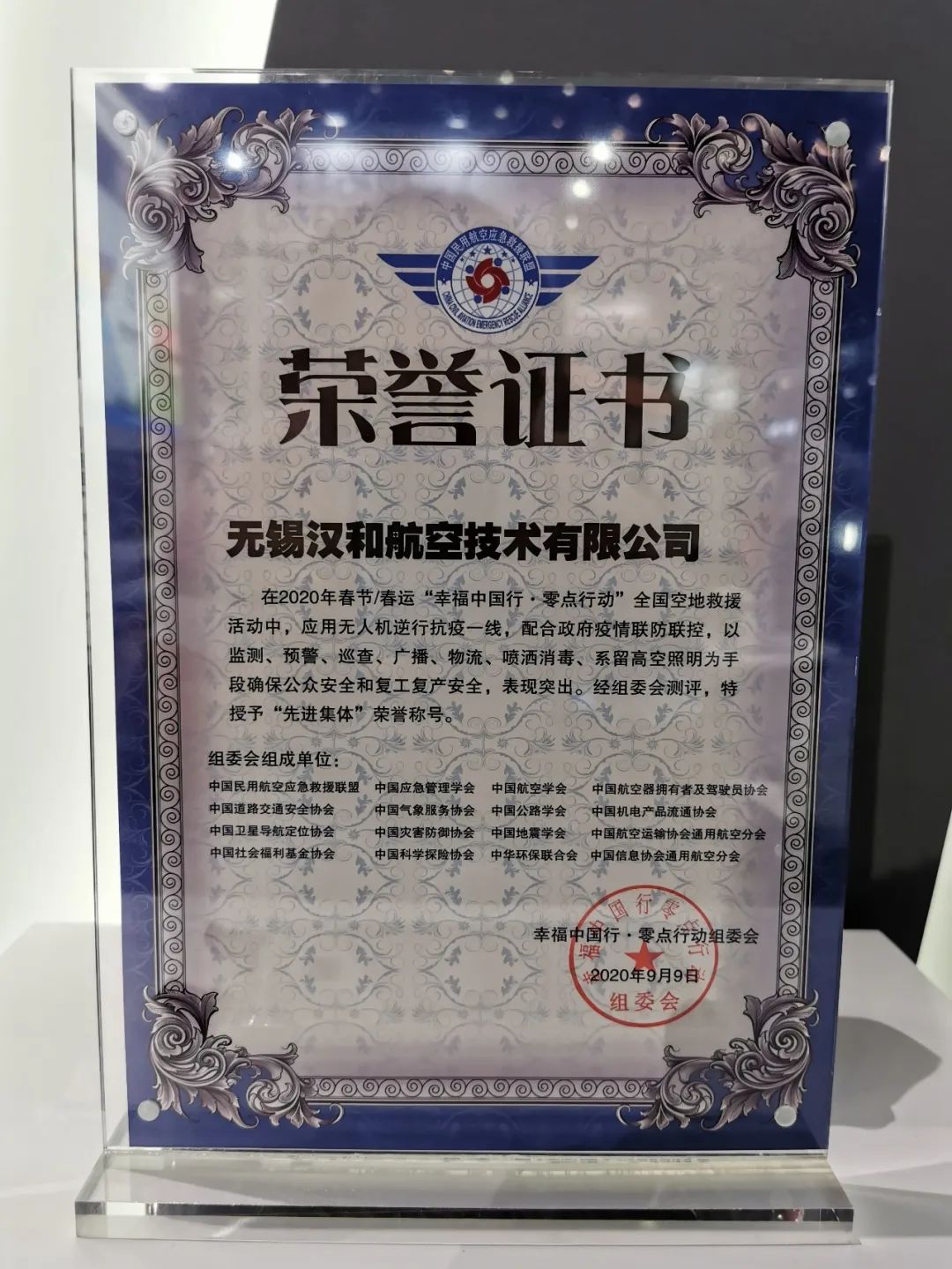 9月13日,2020第四届世界无人机大会在深圳隆重召开。由一场大会、一场展览会、五个分会场以及N场论坛组成,400多家国内外无人机企业带来1000多架最新无人机产品。本届大会专设了无人机应急实战应用高峰论坛,与大会同期举行。无锡汉和航空技术有限公司应邀参加本次大会,作为优秀的无人机企业代表入选2020全球无人机五十强企业。在9月14日“2020无人机(应急)实战应用高峰论坛”暨“幸福中国行·零点行动抗疫先进集体”颁奖仪式中,汉和航空获得了“抗疫先进集体”荣誉称号。