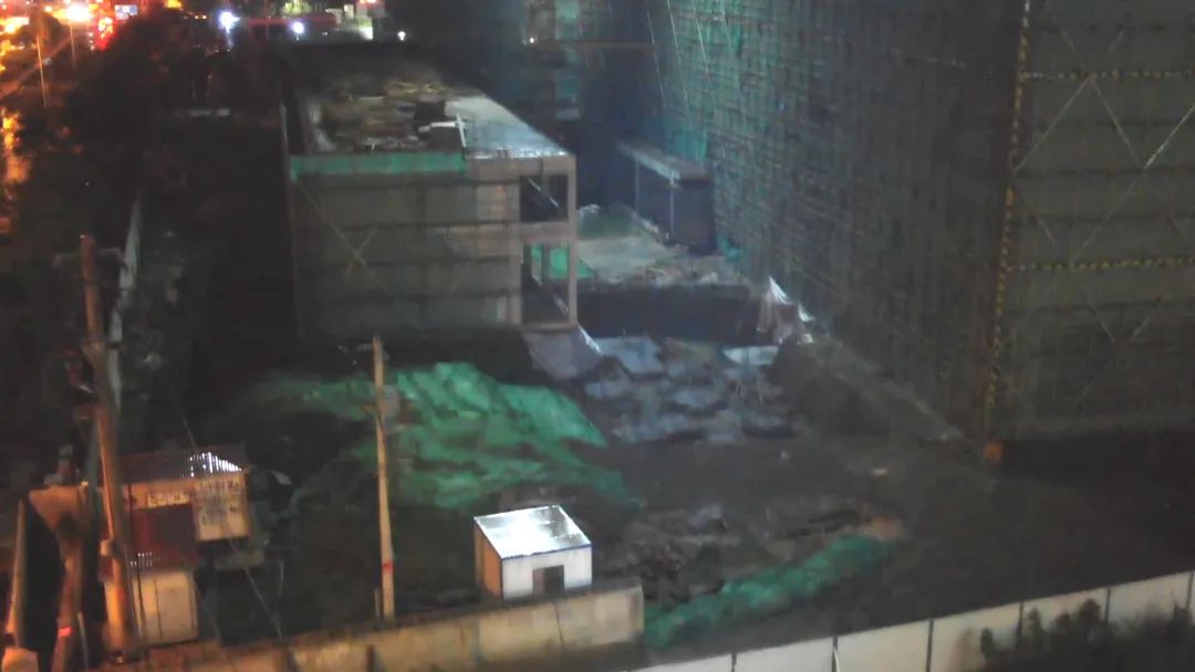 ▲现场航拍画面警方出动无人机升空搜索,在无人机高亮度探照灯的照明下,民警在工地内展开了拉网式的搜查。