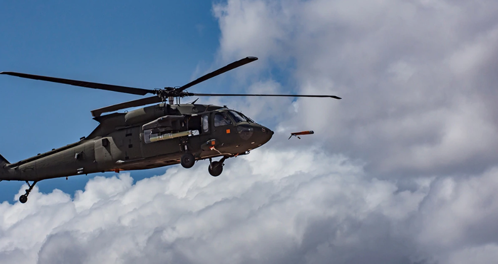 图 2-美国尤马试验场,一架ALTIUS无人机从黑鹰直升机侧边挂载的发射管中被投射出去,并顺利逃离了旋翼下洗流的控制区域