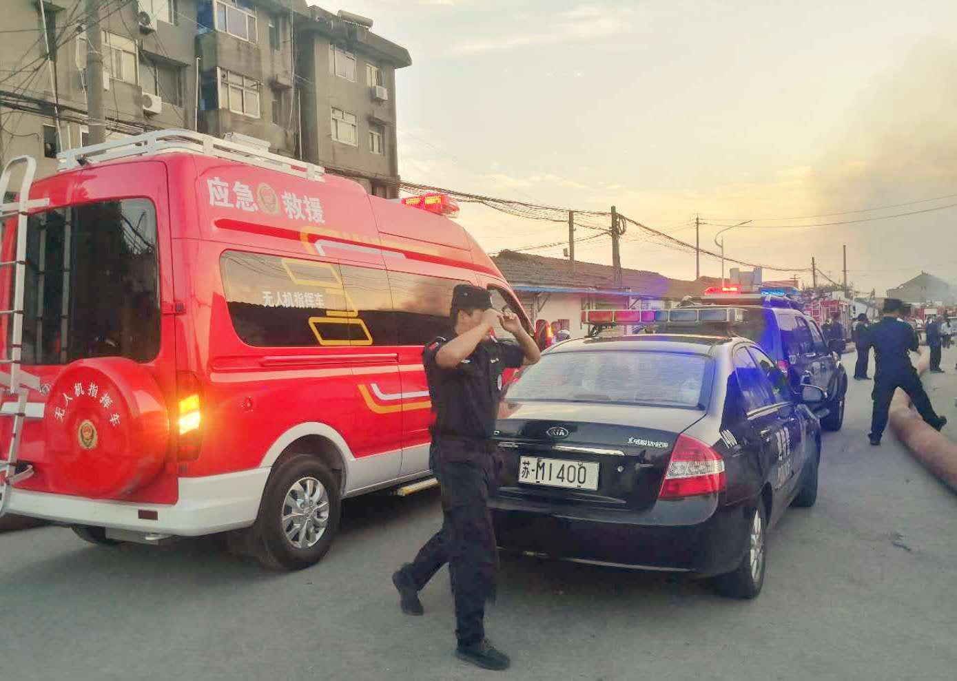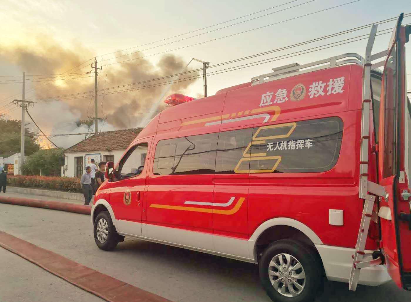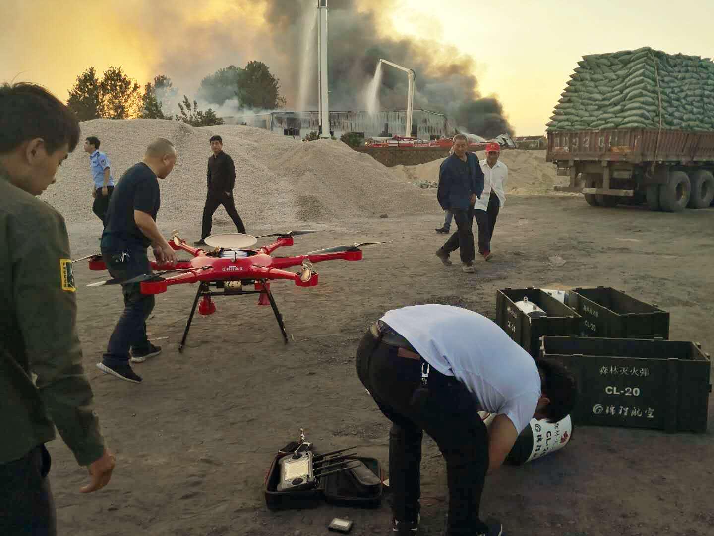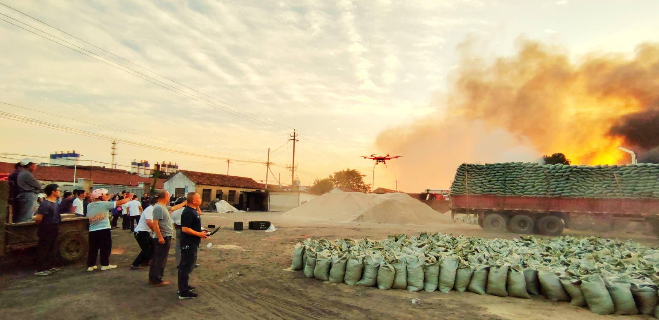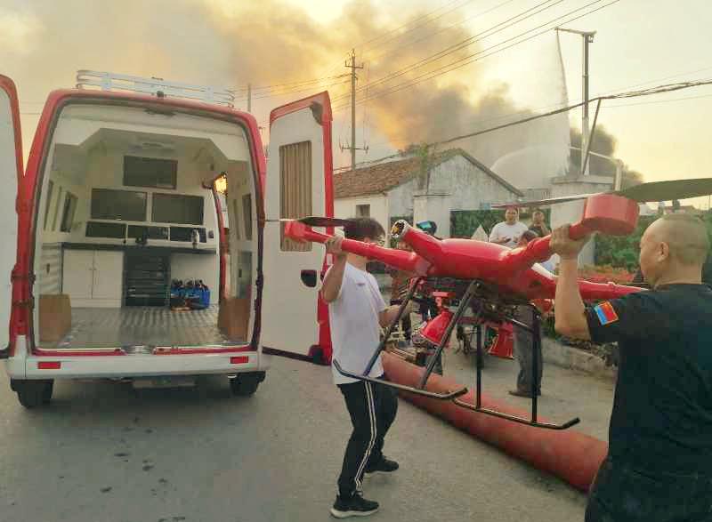 下午15:30分,锦程航空董事长周忠明早已带领团队在户外飞行场地例行消防无人机测试演习,此刻突然接到江苏泰兴某消防局电话请求快速消防无人机支援。第一时间,周董事长带领团队立刻驱车返回工厂携带2台消防无人机、1台警用侦查无人机、1台消防指挥车、10枚20公斤干粉灭火弹快速抵达事发现场。