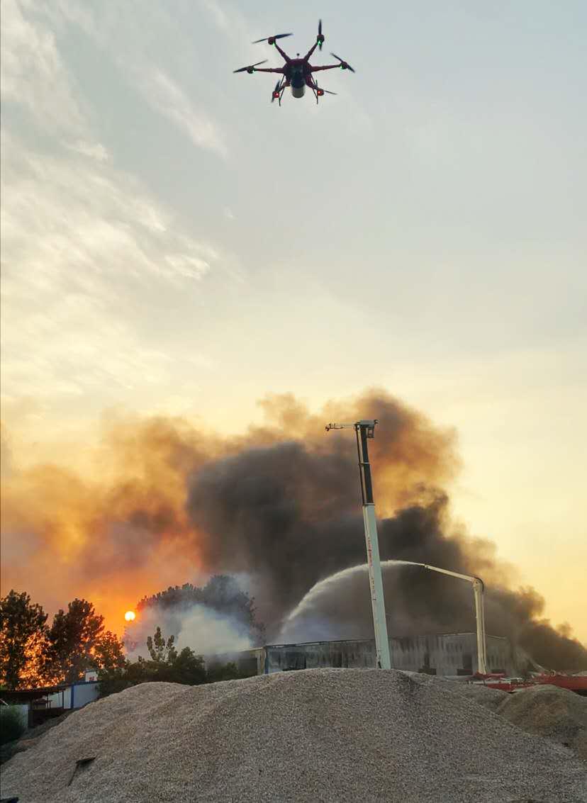 锦程航空专业飞手第一时间快速布置JC-15的预警侦查机(配置高清摄像头、喊话器、夜间照明灯),进行高空侦查火源以及排除周边潜在安全隐患。通过侦查无人机高空回传高清画面,指挥人员在指挥车中清楚观察火源以及周边隐患设施,并通过无人机喊话驱离周边围观人员。