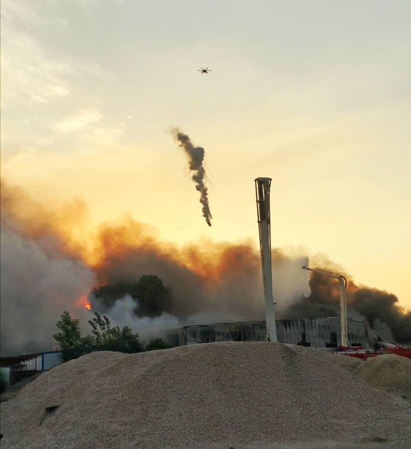 下午16:00,化工厂着火已经2个多小时,消防车已经进行快1个小时的火势压制,虽然有效的阻止了火势的蔓延,但是火源大火并未得到有效的压制。原因是厂内火势太猛,消防员无法携带消防栓抵达火源进行压制。锦程航空一行5人已抵达现场,快速布置无人机。