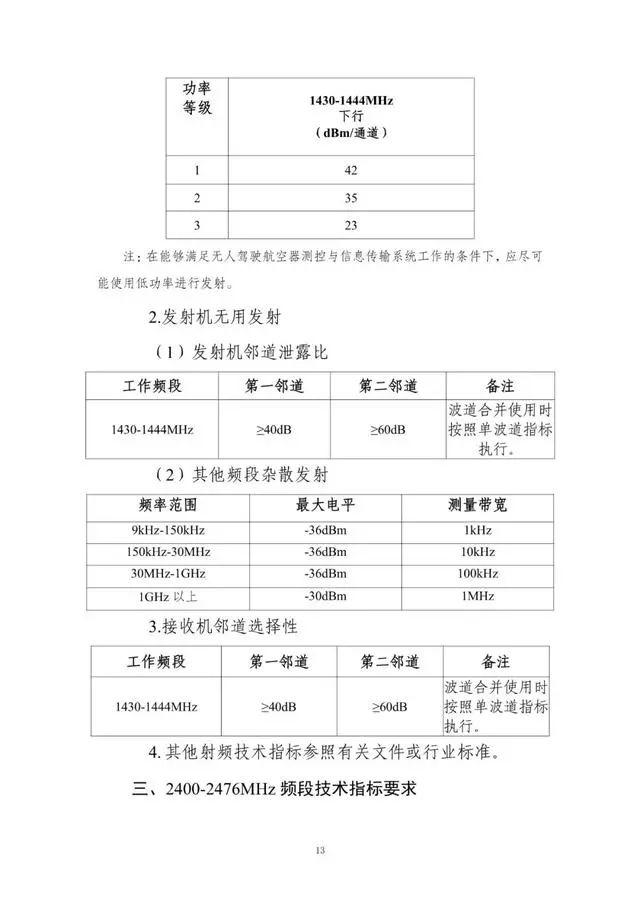 第四条【频率范围】除本办法规定的微功率短距离无线电发射设备外,民用无人机可以申请使用840.5-845MHz、1430-1444MHz、2400-2476MHz ( 以下简称2.4GHz )、5725-5829MHz(以下简称5.8GHz)频段频率用于遥控、遥测、信息传输链路。840.5-845MHz频段用于民用无人机的上行遥控链路,其中841-845MHz频段可采用时分方式用于民用无人机的上行遥控和下行遥测链路。1430-1444MHz频段用于民用无人机下行遥测与信息传输链路,其中1430-1438MHz 频段用于警用无人机和直升机视频传输,其他民用无人机使用1438-1444MHz频段。民用无人机使用 2.4GHz、5.8GHz 频段频率不得提出无线电干扰保护要求。 民用无人机为实现飞行广播等功能所使用的其他无线电频率,应当符合《中华人民共和国无线电频率划分规定》 和无线电管理有关规定。