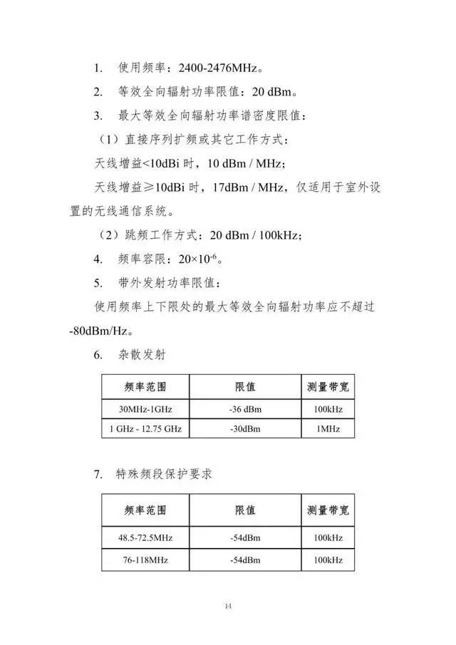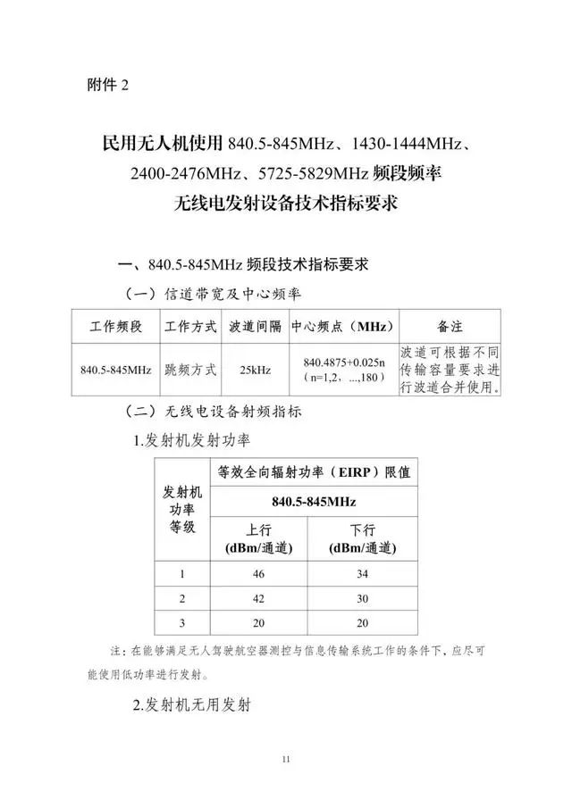 第十四条【型号核准】生产或进口在中华人民共和国境内销售、使用包含无线电发射设备的民用无人机,应当按照国家无线电发射设备管理相关规定,取得无线电发射设备型号核准证,但满足本办法第五条要求的微功率短距离无线电发射设备除外。 民用无人机使用 840.5-845MHz、1430-1444MHz、2.4GHz和 5.8GHz 频段频率的,其无线电发射设备射频技术指标要求见附件2。2024 年 12 月 31 日前,使用2.4GHz、5.8GHz频段频率的民用无人机,可继续申请符合原规定但不符合本办法附件2所列技术要求的无线电发射设备型号核准;自 2025 年 1 月 1 日起,应按照本办法附件2所列技术要求申请无线电发射设备型号核准。