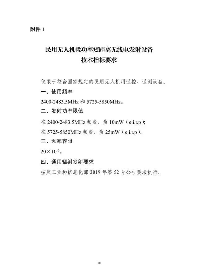 第五条【微功率短距离】民用无人机使用相关无线电频率,且无线电发射设备指标满足附件 1 要求的,按照微功率短距离无线电发射设备管理,无需取得无线电发射设备型号核准、无线电频率使用许可和无线电台(站)设置、使用许可,但应当符合产品质量等法律法规、国家标准和国家无线电管理有关规定。