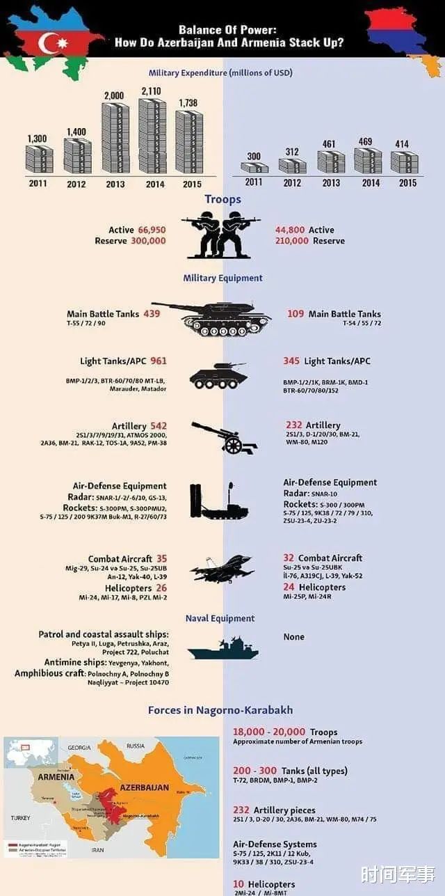 当地时间9月27日,阿塞拜疆与亚美尼亚两国爆发大规模军事冲突。根据目前双方公布的战报显示,阿塞拜疆方面损失27架无人机,4架直升机与33辆坦克及装甲车,被击毙200人左右。亚美尼亚方面损失18架无人机,22辆坦克,15个OSA防空系统,8座火炮和3个弹药库,亚方被击毙500人左右。