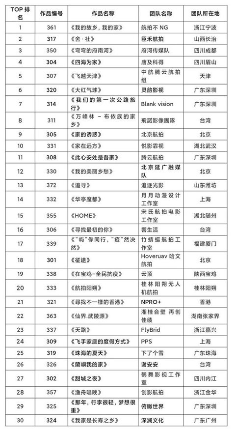 大赛网络投票阶段异常火爆,近百部作品,通过网络及手机端累积获得投票数达10万多票,活动关注人数近五十余万。大赛依据网络投票数(权重40%)与专家评审意见(权重60%)综合计算得出“2020第三届海峡两岸暨港澳无人机航拍创作大赛TOP30”榜单。