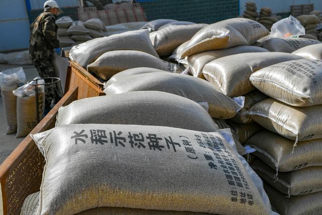 ↑ 10月16日,在新疆农业科学院温宿水稻试验站,工作人员将收获的稻谷装袋。